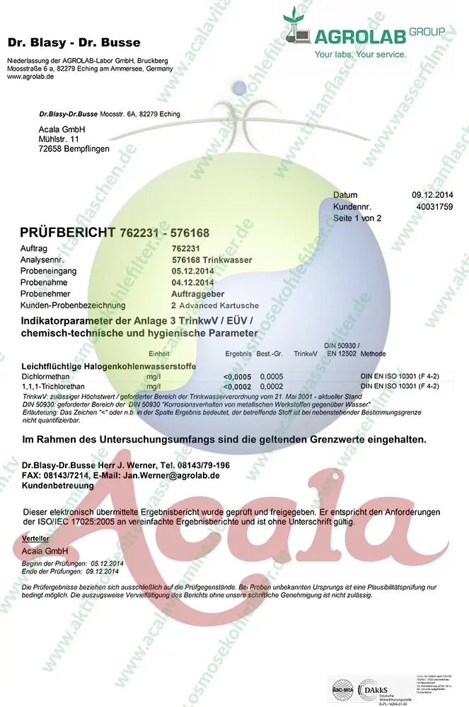 Die AcalaQuell® Advanced Kartusche wurde gezielt auf die Filterleistung gegen Dichlormethan und 1,1,1-Trichlorethan geprüft. Die Ergebnisse des unabhängigen Labors zeigen eine zuverlässige Entfernung dieser Chemikalien aus dem Wasser.