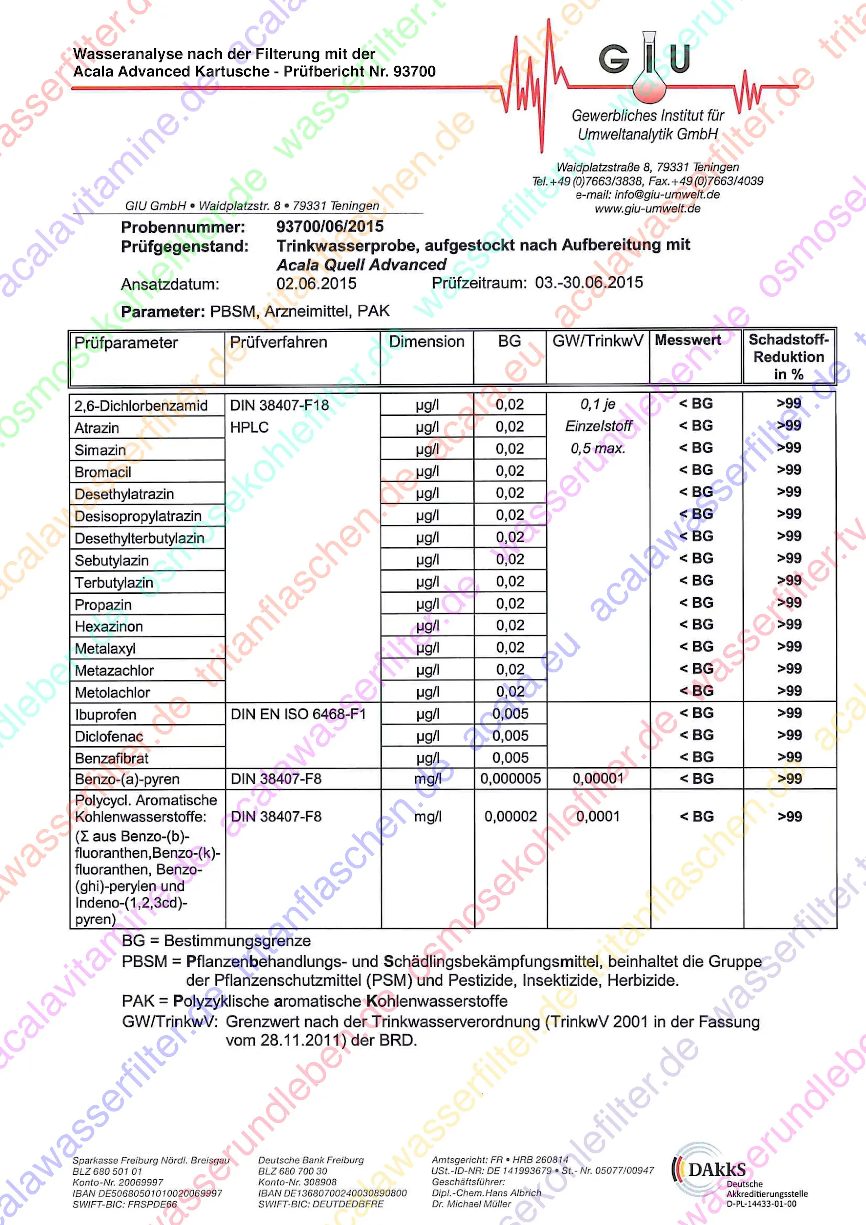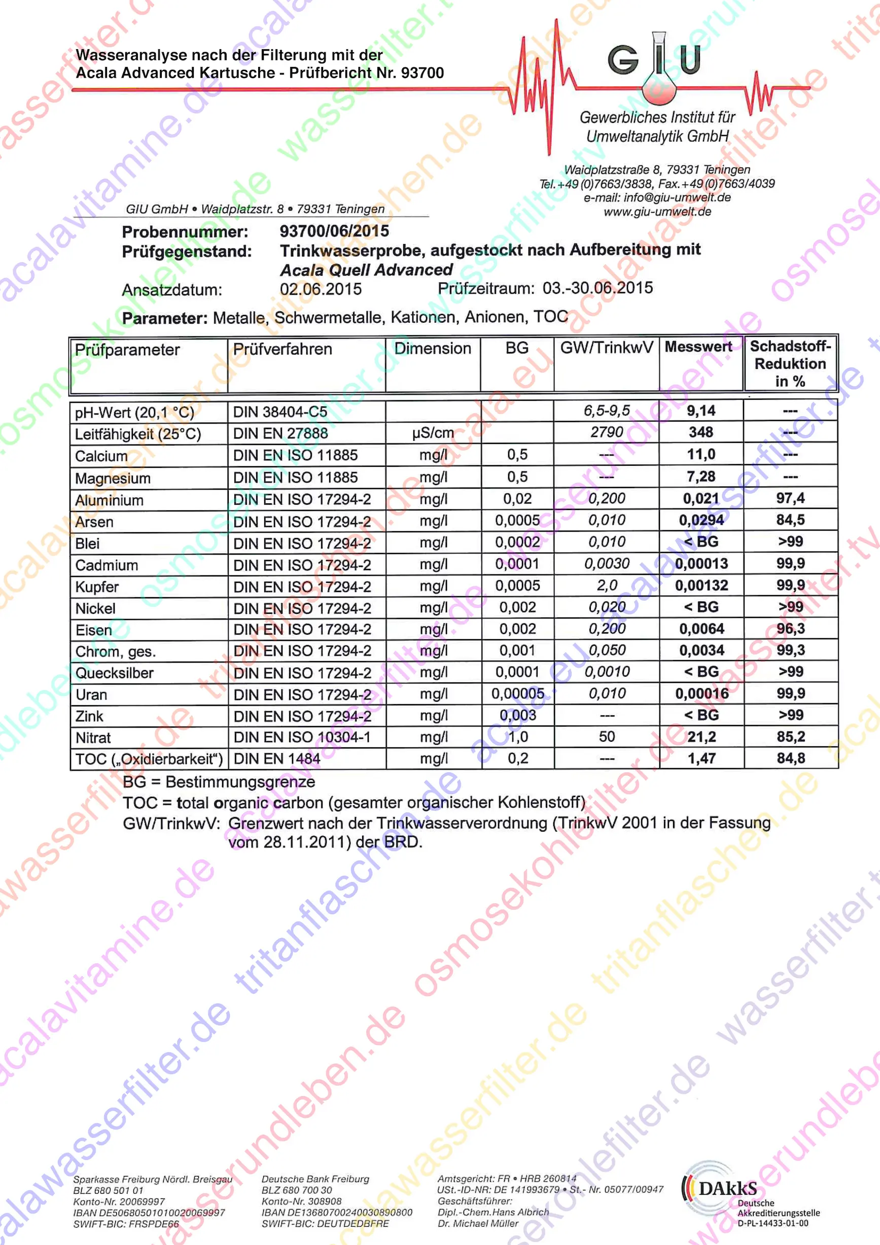 Ein unabhängiges Labor hat die Filterleistung der Acala Advanced Kartusche umfassend getestet. Dabei wurde Leitungswasser vor und nach der Filterung untersucht, um die Reduktion von Schadstoffen zu belegen. Das Ergebnis zeigt deutlich, welche Verunreinigungen effektiv entfernt werden. So können Sie sicher sein, dass Ihr AcalaQuell Wasserfilter eine erstklassige Leistung erbringt und Ihr Trinkwasser sauber und gesund ist.