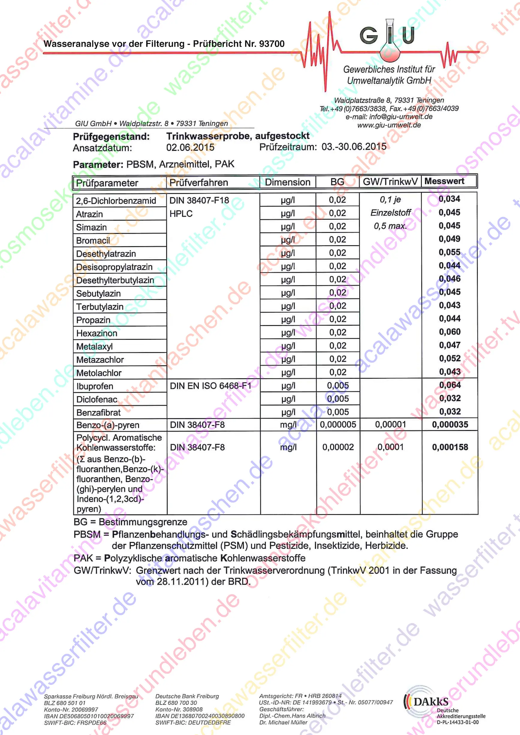 Prüfbericht Seite 3 und 4Testergebnisse Trinkwasser nach der Filterung mit der