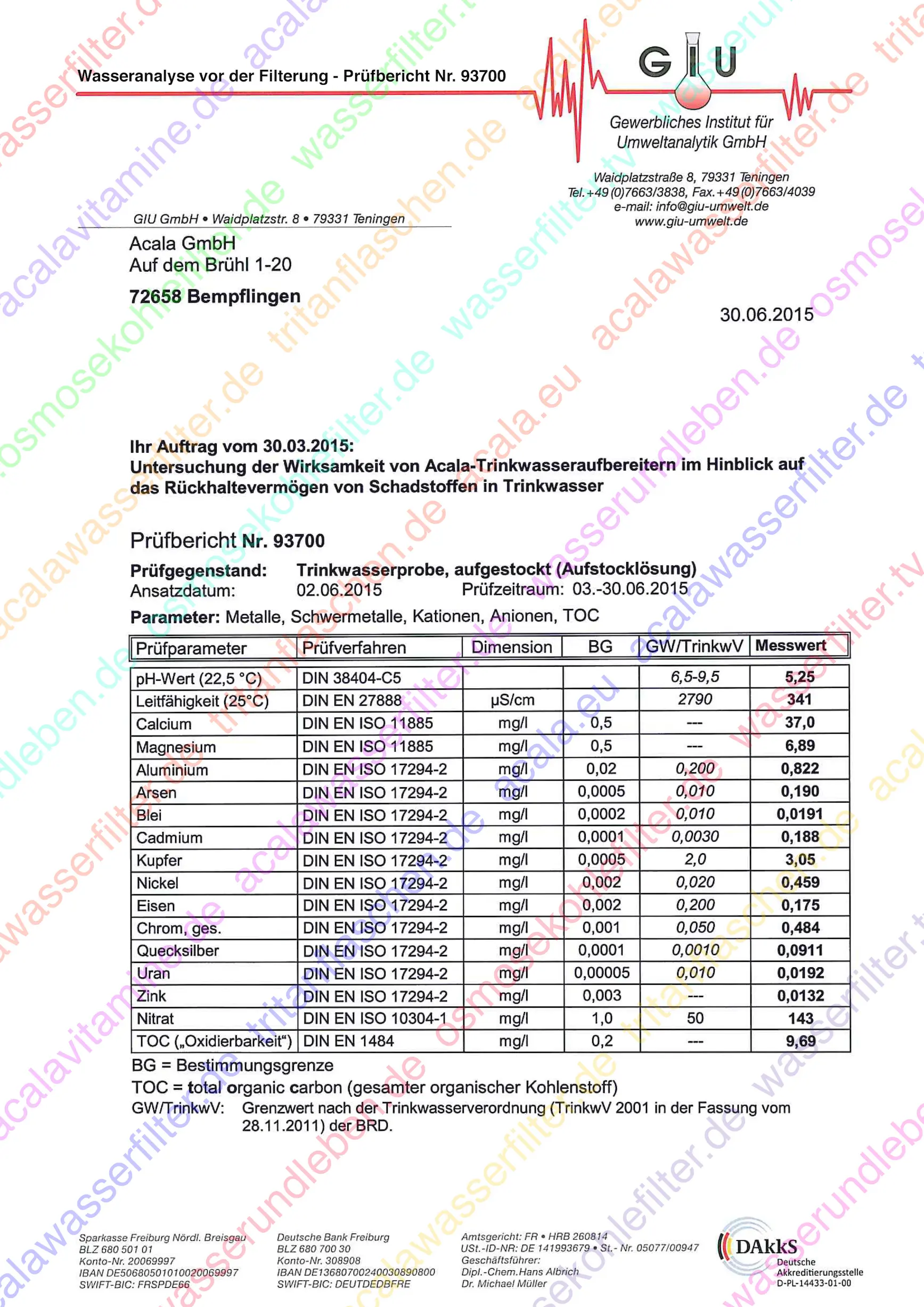 Testergebnis Acala Trinkwasser Laboranalyse: